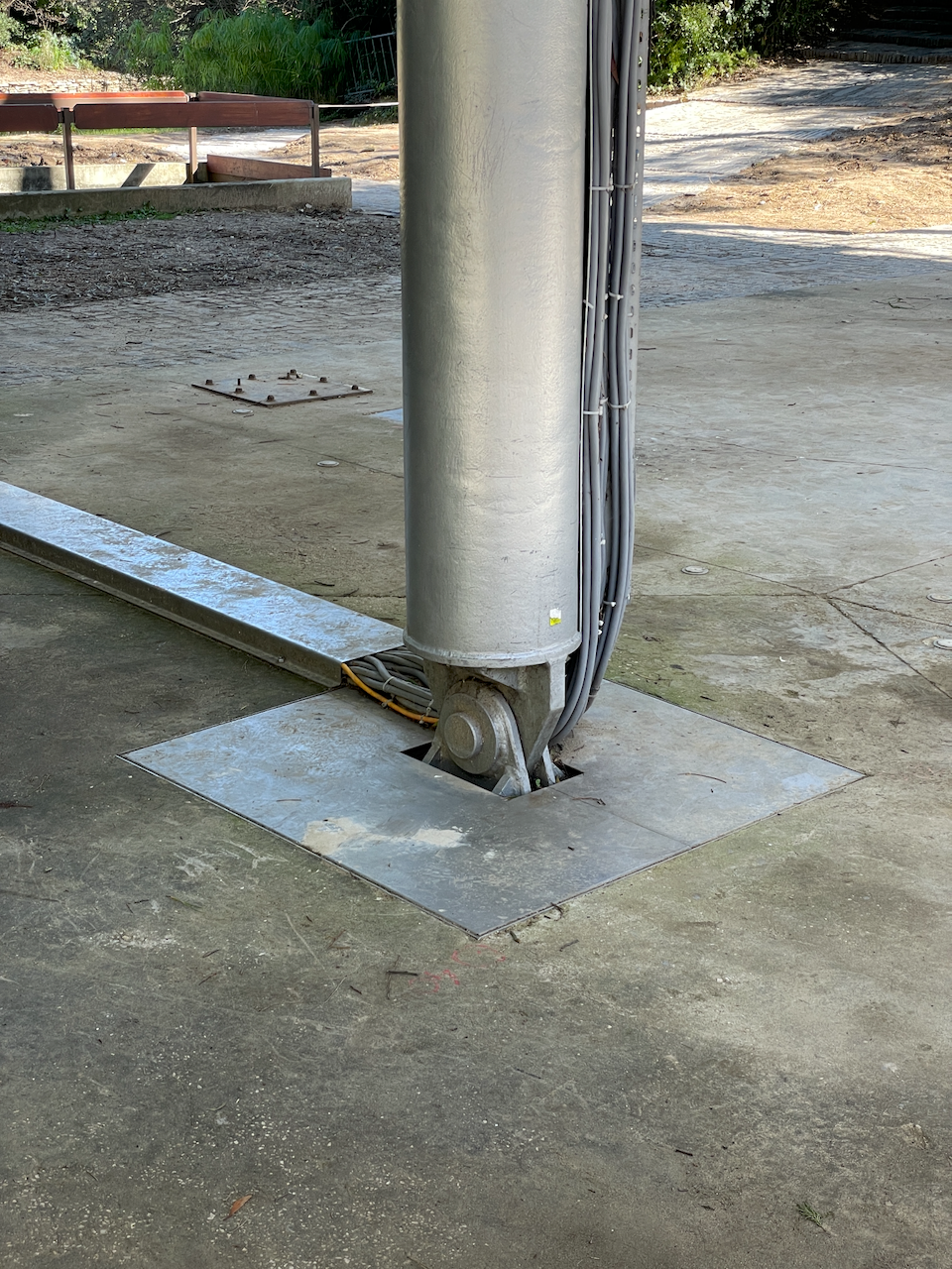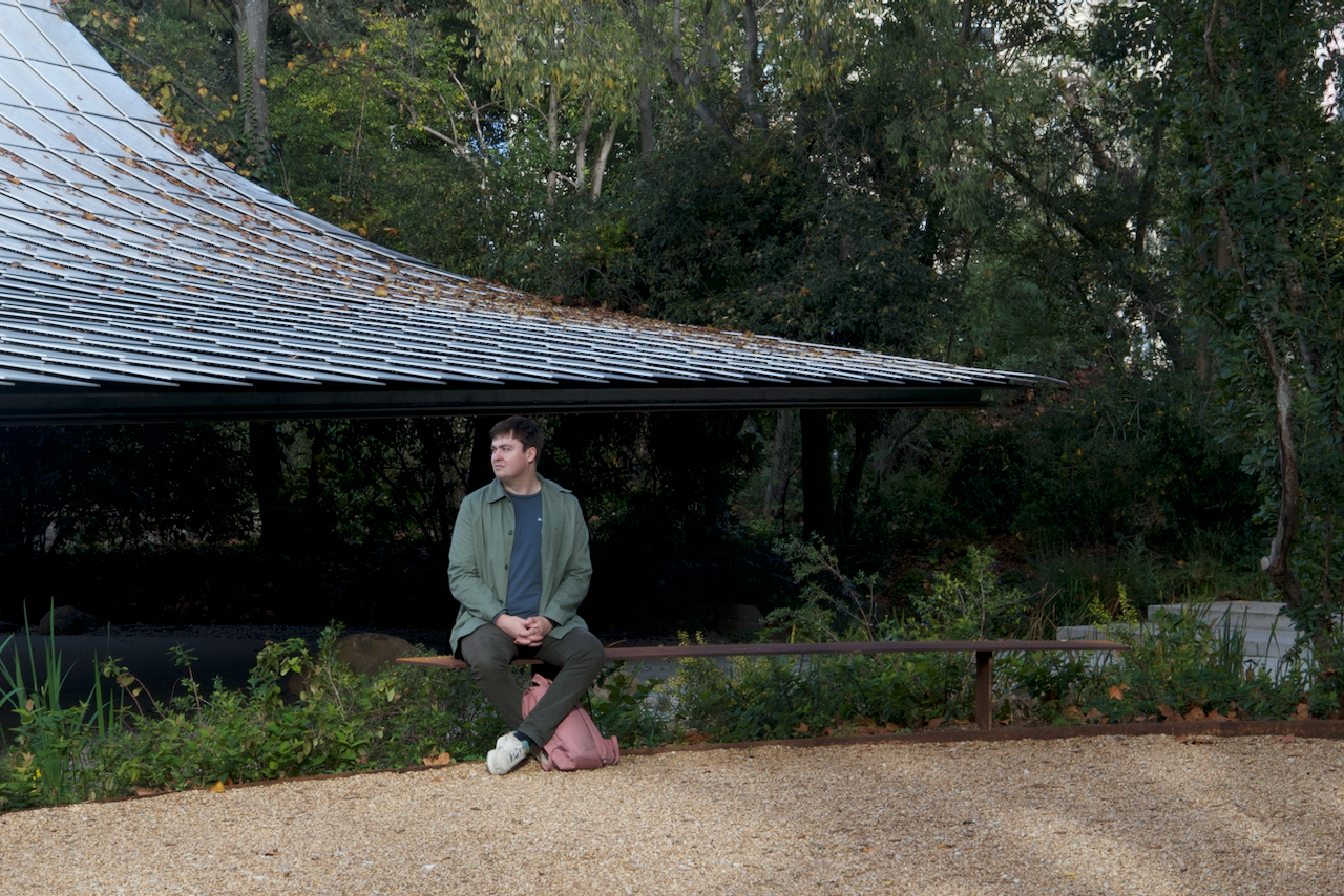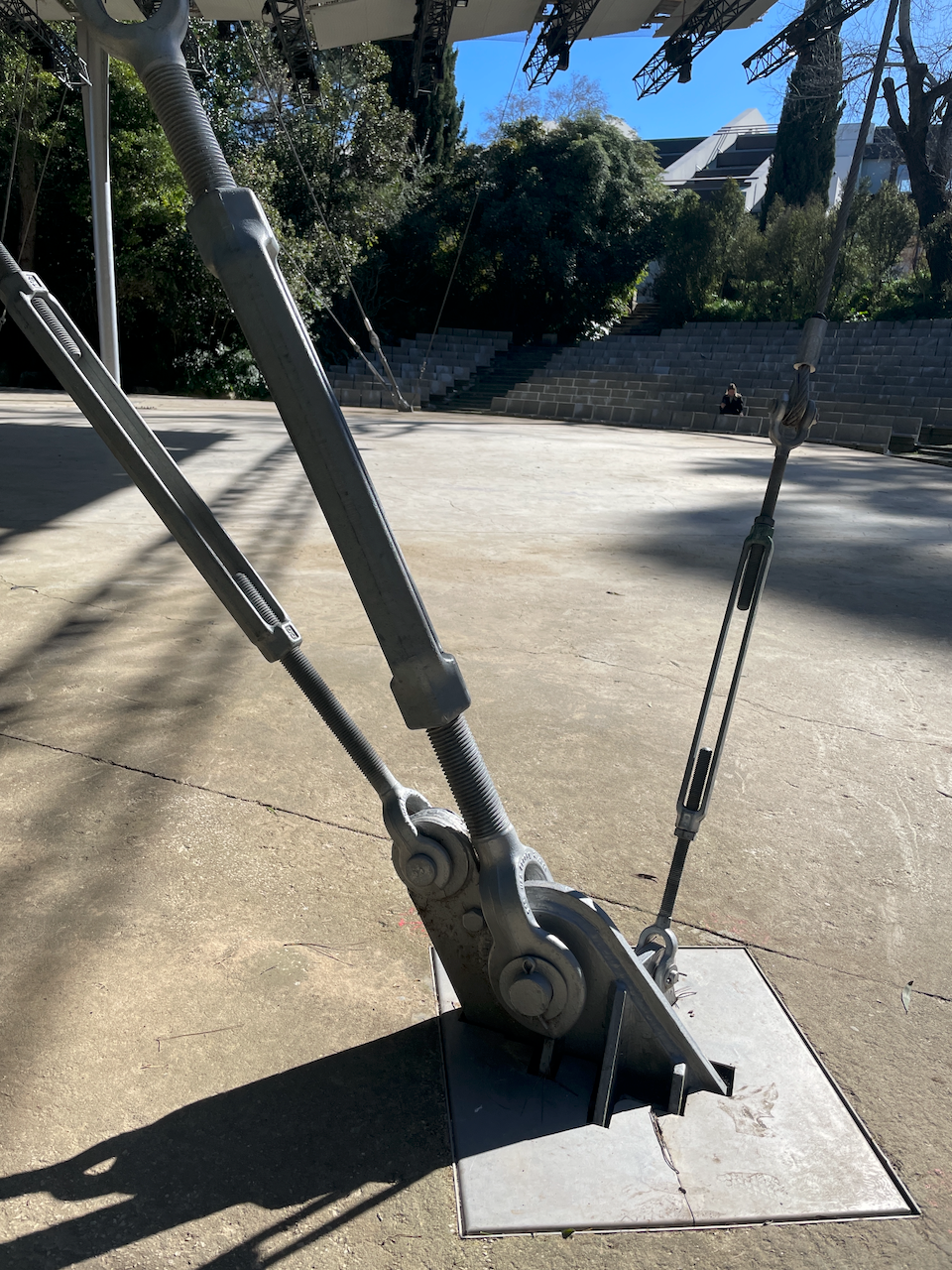 Amphitheater pavilion with cantilevered, pinned tensile structure.